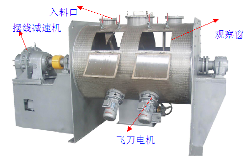 臥式犁刀混合機啟動后犁刀由犁刀軸帶動旋轉(zhuǎn),使物料沿筒體徑向作周向湍動,同時把物料沿犁刀兩側(cè)面的法線方向拋出。當被拋出和作周向湍動的物料流經(jīng)飛刀組時,被高速旋轉(zhuǎn)的飛刀迅速、有力地拋散。物料在上述犁刀和飛刀的復合作用下,不斷疊、擴散、在短時間內(nèi)達到均勻混合,混合精度高。